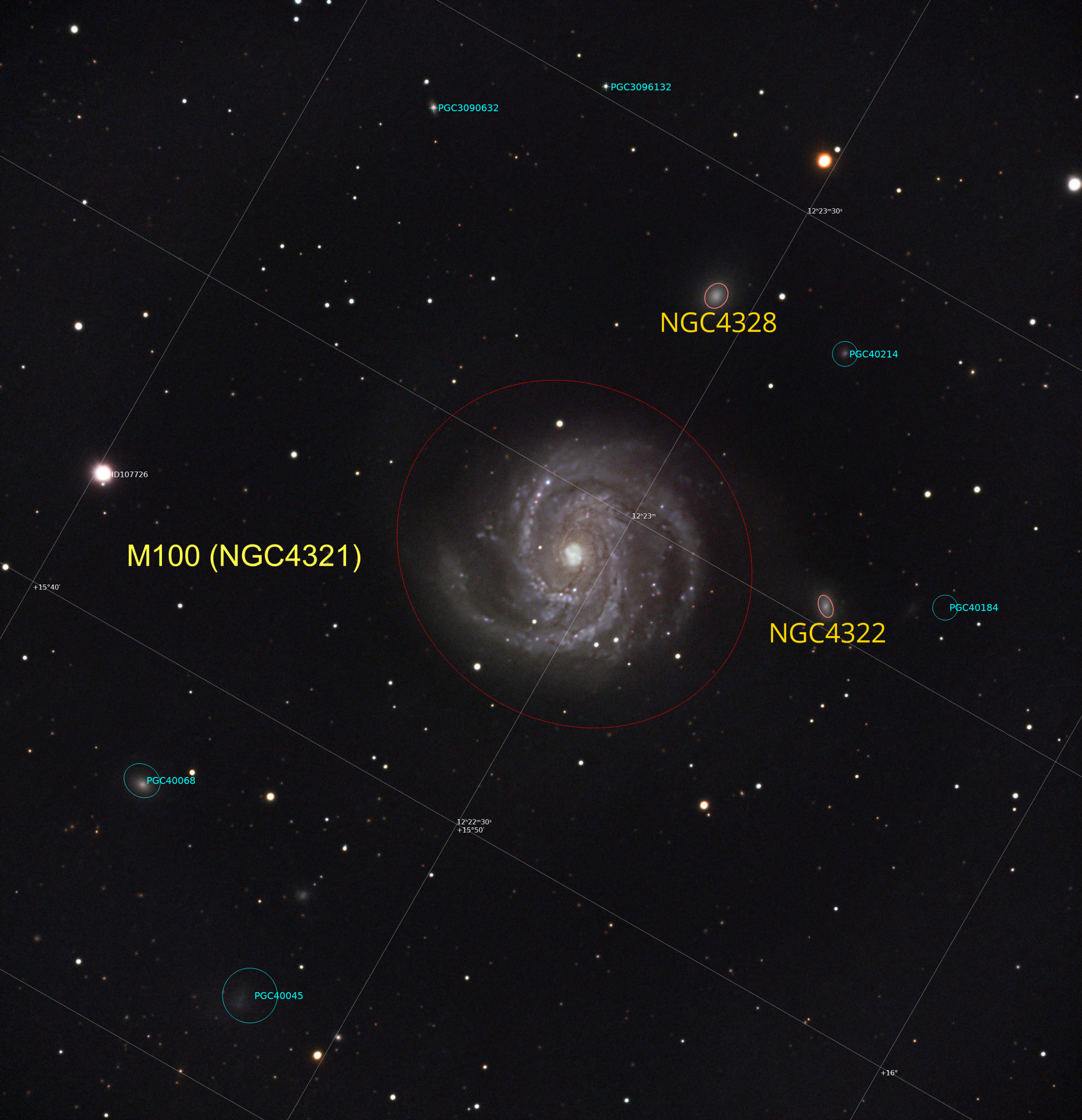 Messier 100 (also known as NGC 4321 or the Mirror Galaxy) is a grand design intermediate spiral galaxy in the southern part of the mildly northern Coma Berenices It is one of the brightest and largest galaxies in the Virgo Cluster and is approximately 55 million light-years from our galaxy, about 166,000 light-years in diameter. It was discovered by Pierre Méchain in 1781 and 29 days later seen again and entered by Charles Messier in his catalogue “of nebulae and star clusters”. It was one of the first spiral galaxies to be discovered,and was listed as one of fourteen spiral nebulae by Lord William Parsons of Rosse in 1850. NGC 4323 and NGC 4328 are satellite galaxies of M100; the former is connected with it by a bridge of luminous matter.