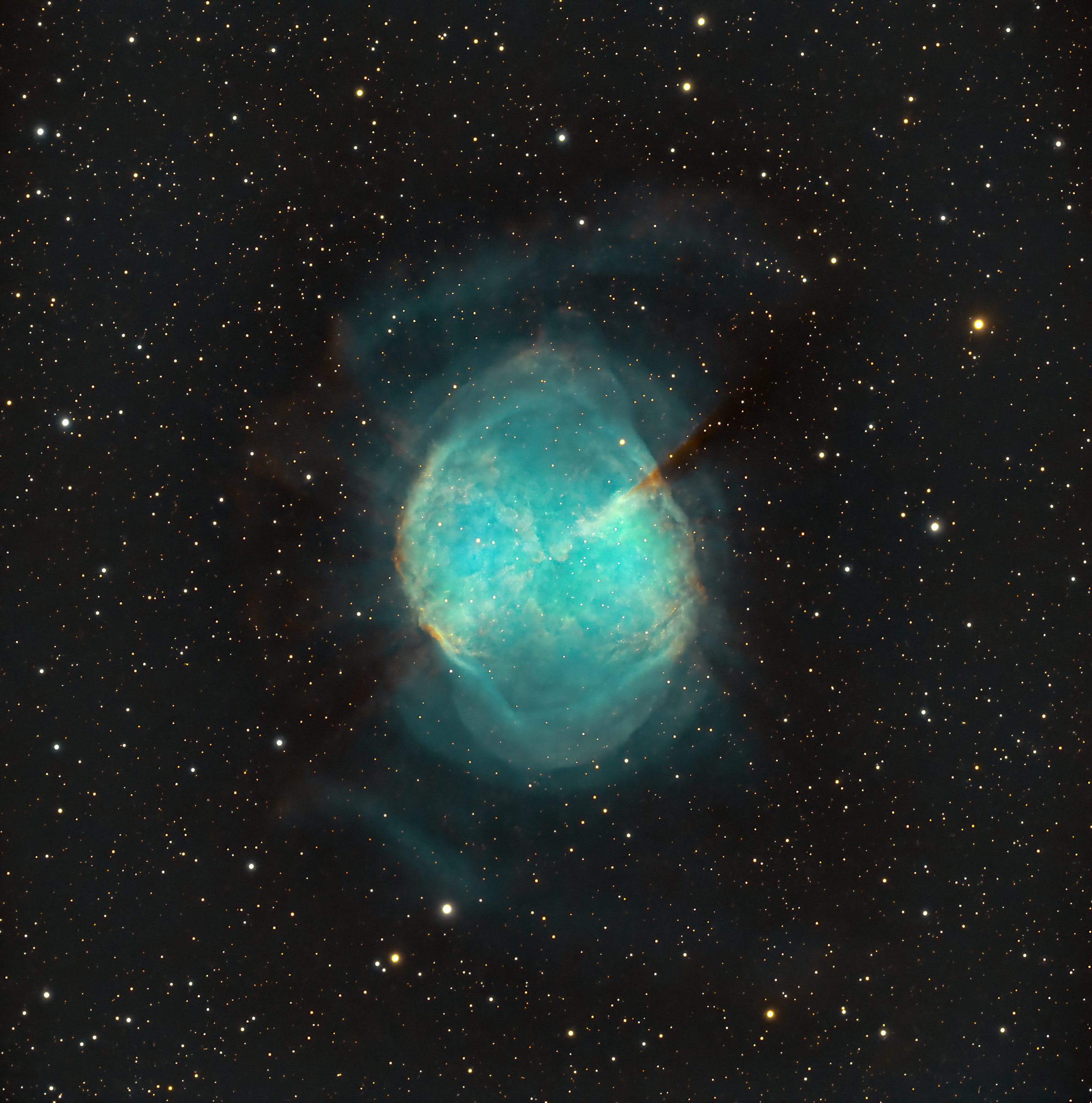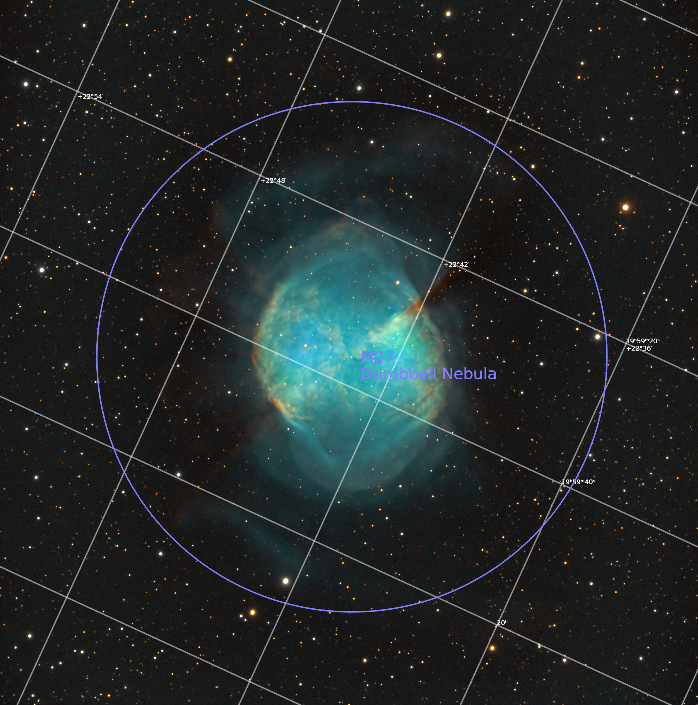 The Dumbbell Nebula (also known as the Apple Core Nebula, Messier 27, and NGC 6853) is a planetary nebula (nebulosity surrounding a white dwarf) in the constellation Vulpecula, at a distance of about 1360 light-years. It was the first such nebula to be discovered, by Charles Messier in 1764. At its brightness of visual magnitude 7.5 and diameter of about 8 arcminutes, it is easily visible in binoculars and is a popular observing target in amateur telescopes.