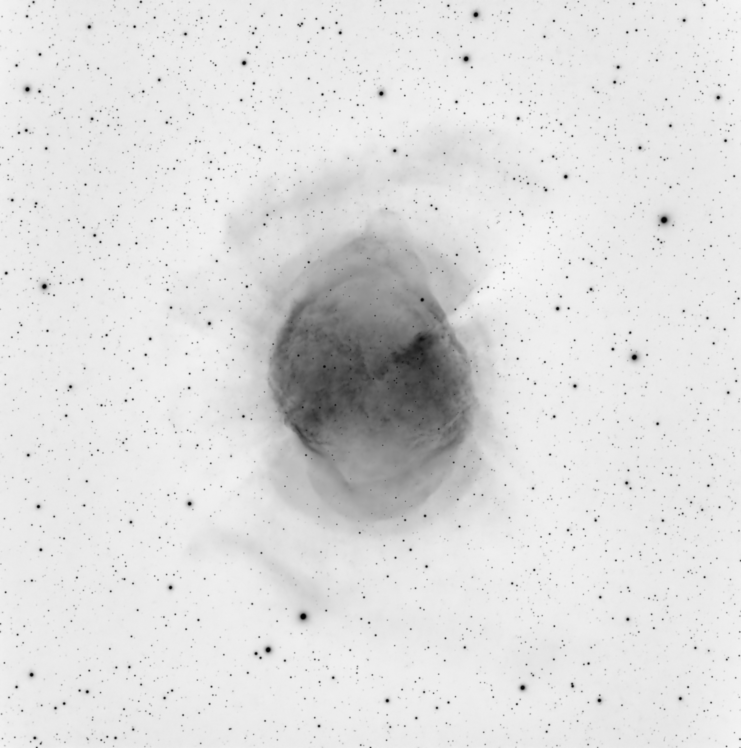 Like many nearby planetary nebulae, the Dumbbell contains knots. Its central region is marked by a pattern of dark and bright cusped knots and their associated dark tails. The knots vary in appearance from symmetric objects with tails to rather irregular tail-less objects. Similarly to the Helix Nebula and the Eskimo Nebula, the heads of the knots have bright cusps which are local photoionization fronts.[5]